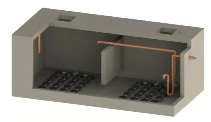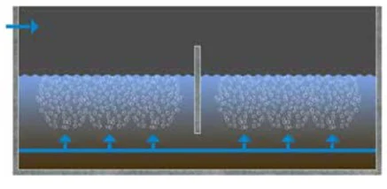 در این مدل، مخزن تصفیه به دو بخش کاملاً مجزا با یک دیوارهی کامل تقسیم شده است. بخش اول برای ورود فاضلاب و ذخیرهسازی اولیه استفاده میشود، و پس از آن، فاضلاب وارد بخش دوم شده و فقط در این قسمت هوادهی انجام میشود. این مدل طراحی سادهای دارد و عمدتاً بهصورت دستی یا نیمهخودکار کنترل میشود. اگرچه عملکرد قابل قبولی دارد، اما در برابر تغییرات شدید بار فاضلاب یا نیازهای خاص تصفیه، محدودیتهایی دارد.